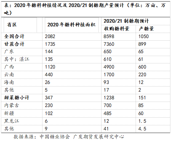 11月1日20/21榨季全国食糖产销工作会议上,各产区公布了对20/21榨季的糖产量预估,为1050万吨,较上一年度增加5万吨。其中广西预计持平,为600万吨,云南预计小幅增加3万吨至220万吨,广东预计减少6万吨至65万吨,海南预计持平为12万吨,内蒙预计增产12.5万吨至85万吨,新疆预计持平为59万吨,合计全国产量预计同比增加10万吨至1052万吨。