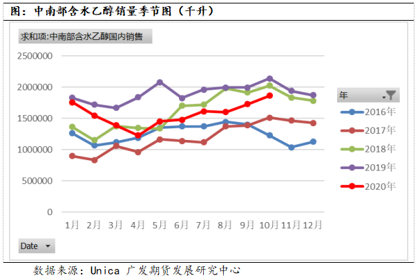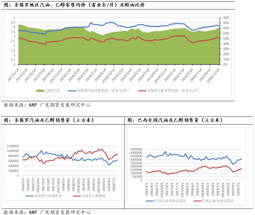 根据巴西蔗产联盟Unica的数据可知,从5月份开始,巴西中南部乙醇国内销售量环比持续增长,10月份,中南部含水乙醇国内销量为1867百万升,环比增加7.9%,较4月份的销量增长52%。但其实这个增幅并不算很高,回溯历史数据,2017年和2018年也达到过这个水平,因为含水乙醇国内销售的季节性特征决定了其在每年的3月-10月整体呈现上涨的现象。因此,不能看到含水乙醇销量在增长就认为是需求恢复导致的,当然需求恢复是一部分原因,但季节性因素也是原因之一。根据季节图,11月份到次年的2月份含水乙醇的销量将下滑,叠加目前乙醇价格大于汽油价格的70%或导致消费者更倾向于消费汽油,那么11月份含水乙醇的销量有可能见顶回落,对含水乙醇价格上涨的支撑力可能减弱。