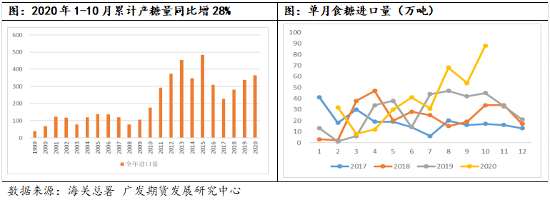 10月份,进口量不减反增,达到所有月份的创纪录高位。2020年1-10月份,全国累计进口食糖364万吨,同比去年的284万吨增加80万吨,甚至较去年全年的进口量增加26万吨。