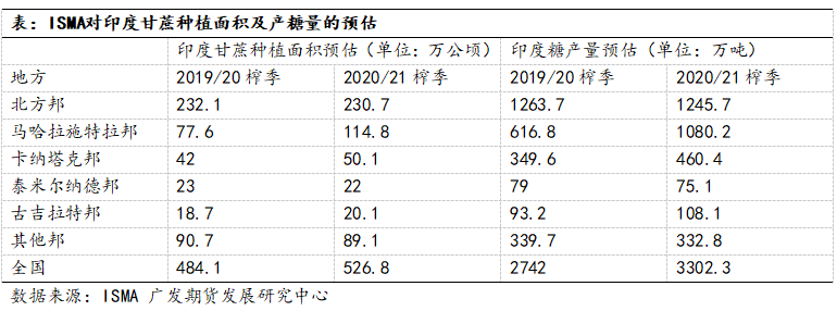 在2020年10月19日的ISMA会议上,公布了对20/21榨季印度糖产量的首次预估。会议预测20/21年度印度糖产量为3302万吨,考虑甘蔗汁和重B型糖蜜转向乙醇生产后,ISMA预计20/21年度糖产量为3100万吨。预计20/21年度印度全国甘蔗面积约为526.8万公顷,同比增加9%。