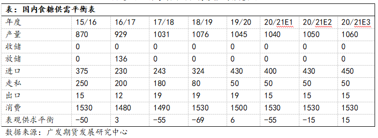 我们根据对20/21榨季食糖产量、进口量的不同的预估,对国内食糖供需平衡表进行三种情况的预测。产量方面,目前中国糖业协会对20/21榨季的产糖量的预计为1050万吨,但据市场各方的调研情况,20/21榨季产糖量持平或者略减的可能性仍是存在的,因此我们也做了1040万吨和1060万吨的预估。进口方面,19/20榨季,375万吨的进口糖叠加80万吨进口糖浆折成的55万吨的白砂糖总计进口量达430万吨,20/21榨季,正规渠道进口量很有可能延续今年的数量,另外如果没有出台政策管控糖浆进口,明年糖浆进口量预计延续增长,因此我们根据进口政策趋严、维持、趋松作出了400、430、450万吨的进口量的预估。