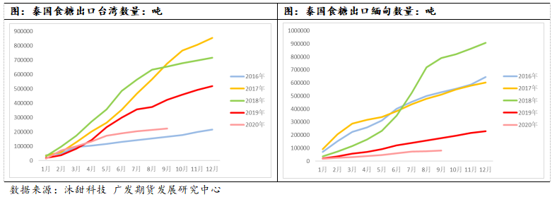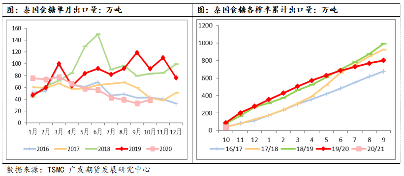 消费方面,泰国年食糖消费量变化不大,基本上在300-350万吨之间,19/20榨季由于疫情的影响,泰国食糖消费量受影响下滑,明年预计能恢复,但由于泰国食糖减产,而且期初库存减少,明年可供出口量将大幅减少。