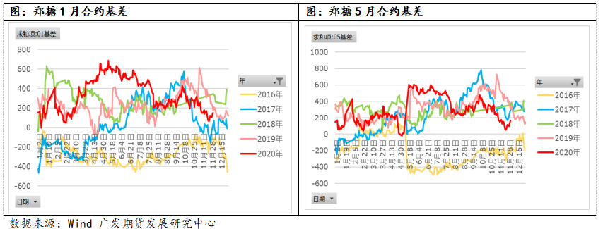 10月份初,期货价格走强,上涨幅度大于现货价格,引发基差走弱;10月中旬起,因消费转淡叠加进口量预期增多,市场压力增大,期货价格承压下行,现货价格也应声下跌,跌幅超过期货,基差进一步走弱;11月下旬起,现货价格跌势暂缓,跌幅减小,基差有所走强。当前时点为12月初,郑糖1月合约与5月合约基差都落在0-200元/吨之间,属于区间偏低的水平,但是由于加工糖厂库存充裕、加工糖供应量大的压力下,贸易商做多基差的动力不强,短期内基差或仍处于0-200元/吨区间震荡。长期来看,当前基差处于低位。
