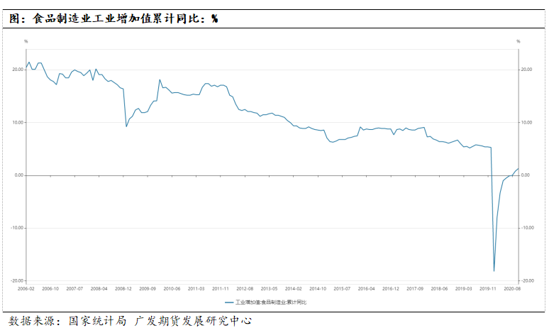 食品制造业工业增加值也有相似的表现,近些年以来除极端情况外,整体延续增长的势头,并且增速放缓,今年疫情最严重的时候因停工停产工业增加值增速为负,但目前已恢复到正增长。
