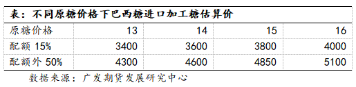一方面,内外价差虽然收敛,但仍为正值,说明进口仍有利润,因此11-12月份进口量将继续保持高位,国内糖市供应不小;另一方面,基于我们对国际原糖中长期看多的观点,未来随着原糖价格上涨,国内糖价也将受带动。下表是在不同原糖价格下行,巴西糖进口加工糖的估算下,当国际原糖在13-16美分/磅区间时,配额外50%的关税下进口加工糖估算价在4300-5100元/吨之间,如果未来国际原糖价格上涨到16美分,5100元/吨将的价位成为国内糖价的强力支撑点。