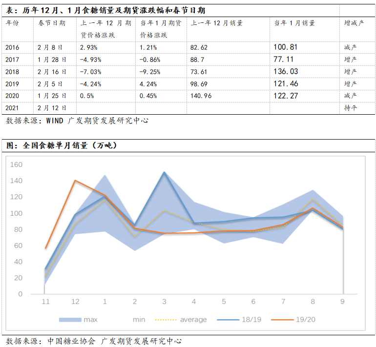 全国食糖单月销售量存在淡旺季之分,通过观察全国食糖单月销量均值曲线,我们能够知道每年的12-1月份为一年中销售最旺的时候,这主要因春节备货的存在而导致的。通过观察历年12月、1月的销量以及春节日期可以发现:春节日期在1月份的年份,上一年12月份的销量大于当年1月份的销量,反之春节日期在2月份的年份,上一年12月份的销量小于当年1月份销量。2021年的春节日期在2月12日,单月销量可能和2018年有些类似,那么今年的春节备货期可能从12月下旬开始启动到1月下旬结束,这一阶段受需求提升的推动,糖价有望迎来一波上涨。