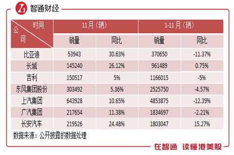 智通财经了解到,各大车企均已公布了11月及前11个月的销量,11月份均保持了按月同比增长,其中比亚迪、长城(02333)、上汽、广汽(02238)及长安实现双位数增长,比亚迪以30.63%的增长水平领跑行业。前11个月,整体汽车板块受疫情影响销量下降,不过长安汽车表现亮眼,实现销量增长15.27%,主要为销量常年下滑导致基数较低。