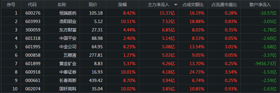 从个股来看,主力资金最青睐的3只股票分别是恒瑞医药、洛阳钼业、东方财富,流入金额分别为15.37亿元、7.52亿元、6.85亿元,所对应的涨幅分别为8.42%、10.11%、4.44%。