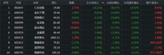 从个股来看,仁东股份、老白干酒招商银行分别遭主力资金卖出10.21亿元、8.83亿元、4.33亿元。