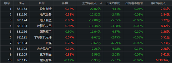 主力资金流出的板块分别是饮料制造、电气设备、电子制造,主力资金流出金额分别为22.02亿元、12.82亿元、12.08亿元,其中散户净流入金额为7.63亿元、1.84亿元、3.72亿元。