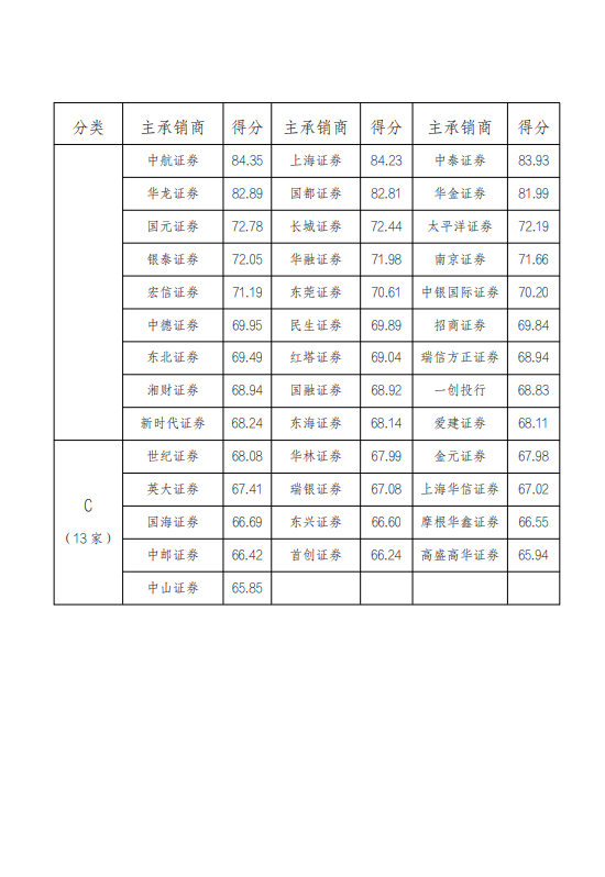 本次受评主承销商合计87家,其中2019年主承销1支及以上企业债券(不含仅参与联席主承销)的机构53家,仅作为联席主承销商参与承销或仅从事企业债券存续期管理工作的34家。按照评价得分由高至低排序,将87家受评主承销商分为A、B、C三类。其中A类主承销商26家,平均得分90.58分;B类主承销商48家,平均得分79.16分;C类主承销商13家,平均得分66.91分。