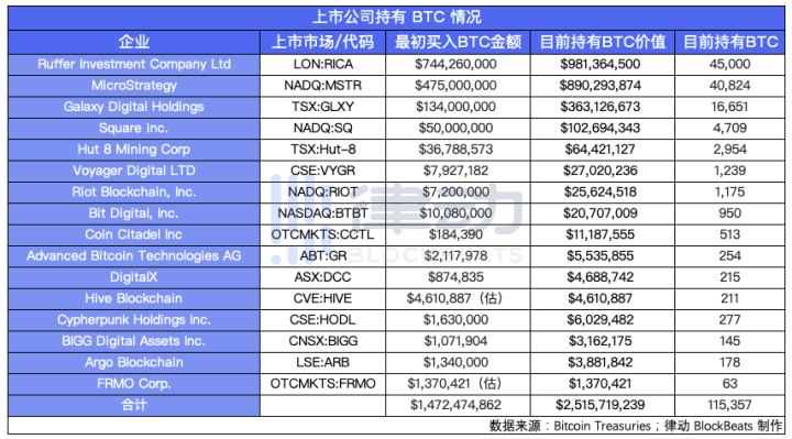根据 Bitcoin Treasuries 数据,目前一共有 16 家上市公司买入了 BTC,合计投资 14 亿美元,目前总持有 11.53 万枚比特币,目前整体资金已经浮盈 70.84%(12 月 17 日数据)。
