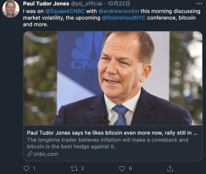 华尔街知名投资人保罗·都铎·琼斯于 2020 年 5 月表示,将其大于 1% 的资产配置到比特币上。这位美国亿万富翁对冲基金经理在 1980 年成立了都铎投资公司(Tudor Investment Corporation),目前管理着 90 亿美元的资产。