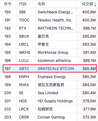 灰度引发的热议不在于为机构带来了比特币,而是将比特币带到了美股市场。在这个全球流动性最大的市场中,GBTC 日成交量约 4 亿美元,和星巴克、甲骨文等巨头无异,甚至已经超过今年涨了 24 倍的医疗类宠儿 NVAX。