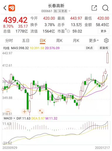 今日,医药界另一明星公司,被称为“东北茅台”的长春高新同样表现不俗,截至收盘大涨8.7%,报收439.42元/股,总市值为1778亿元。关于今日大涨,市场普遍认为是减持靴子落地的原因。