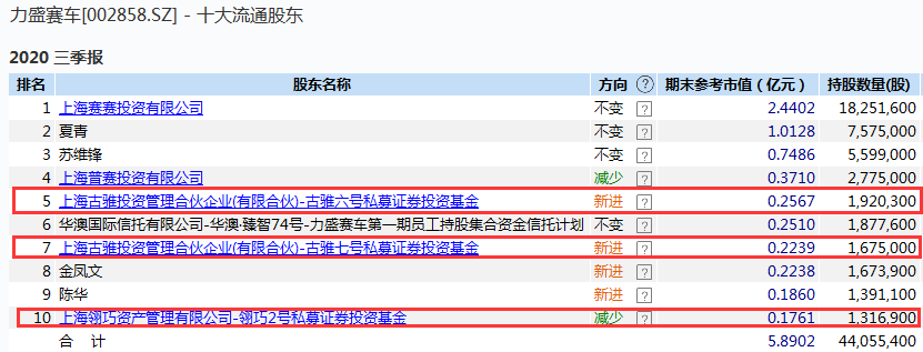 不过,“韩寒概念股”的头衔也让力盛赛车受到了新成立的私募基金的关注。Wind数据显示,力盛赛车2020三季报前十大流通股东中,新进了同一私募基金公司旗下于8月刚成立的两个产品,即上海古雅投资管理合伙企业(有限合伙)旗下的古雅六号和古雅七号,分别成立于8月5日和8月24日,持有192万股和167.5万股,位列第5和第7大流通股东。