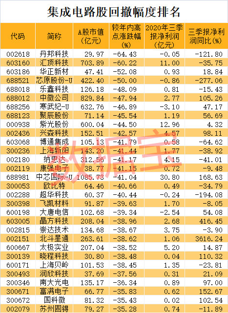 不过相比年初的火爆,集成电路公司当前走势已降温不少。最新收盘价与年内高点相比,近六成股票回撤幅度在30%以上,其中丹邦科技、汇顶科技、华正新材、芯原股份等4股回撤幅度超过50%。