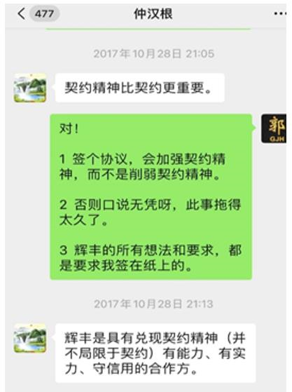 事实上,郭俊辉曾多次要求*ST辉丰签署协议,以从法律上确定草铵膦项目属于瑞凯化工。2017年4月20日,李萍在微信中语音回复称,“我觉得你的目的不就是想确认一下辉丰5000吨的装置的权益归瑞凯所有的书面形式吗?因为仲总(注:仲汉根)已经同意,以前说过若干遍的话,再说一遍也就这么回事。”仲汉根则在2017年10月28日就签署协议事宜回复称,“契约精神比契约更重要。”当郭俊辉再次希望签署协议时,仲汉根称,“辉丰是具有兑现契约的精神(并不局限于契约),有能力、有实力、守信用的合作方。”