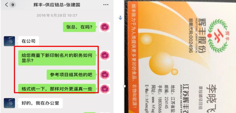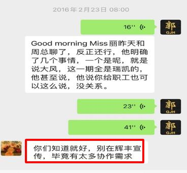 郭俊辉分别和李萍、仲汉根近几年的微信聊天记录不仅如此,*ST辉丰相关人士还将“石家庄瑞凯(辉丰)三期项目”改称为“辉丰HF06项目”,并要求瑞凯化工的相关负责人所使用的“瑞凯化工”的名片修改为“辉丰股份”的名片,并称“格式统一下,那样对外更逼真一些”。