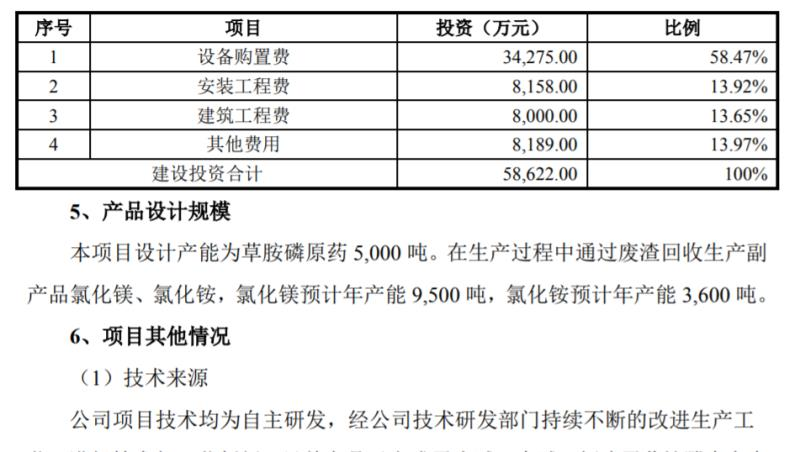 2016年4月21日,*ST辉丰公开发行了总额8.45亿元的可转债,其中5000吨草铵膦项目预计投资6.86亿元(项目建设投资5.86亿元,主要包括建筑工程投资、机器设备投资等;铺底流动资金1亿元)。经测算,该项目达产后预计可实现年均销售收入8.47亿元,年均实现净利润 3.42亿元。当时*ST辉丰称,“公司项目技术均为自主研发。”