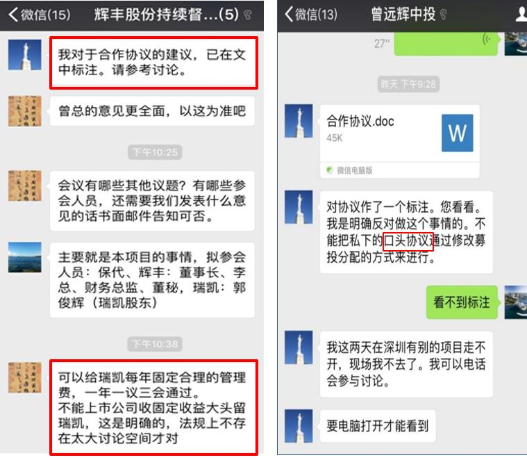 2017年11月,*ST辉丰自己将《年产5000吨草铵原药项目合作协议》修改为*ST辉丰出资,约定所有收益归瑞凯化工,但强调上该协议称需要可转债券商中投公司同意。此后在2017年11月28日,李萍将一份券商中投公司人士曾远辉的聊天记录及一份标注后的合作协议转发给郭俊辉。曾远辉在与李萍的对话中表示,“不能把私下的口头协议通过修改募投分配的方式来进行。”