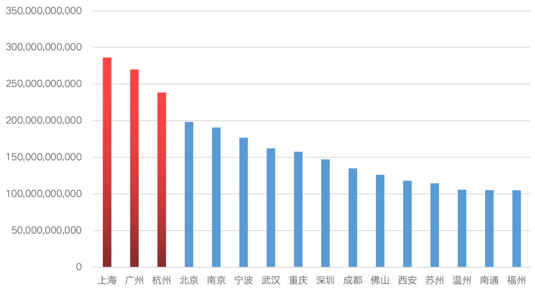 CRIC统计数据显示,截止到2020年12月17日,全国重点50个城市土地出让金额达到4.31万亿,其中上海土地出让金居全国首位,达到了2861亿元,同比增长39.52%,其次,广州、杭州分别以2697亿元、2385亿元位列第二和第三位。此外,北京、南京、宁波、武汉、重庆、深圳、成都、佛山、西安、苏州、温州、南通和福州的土地出让金也突破千亿元,至此,全国已有16城土地出让金超过千亿元。