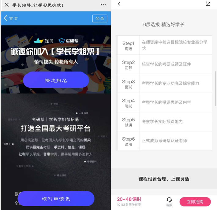 在考研帮的APP和官方网站上可以看到,考研帮针对“院校专业1对1辅导”所打出的宣传语极具诱惑力:“高分学长+6层选拔+讲前培训”。“6层选拔”指的是海选、初筛、面试、笔试、试讲、录用。据其介绍,在海选时,会筛选出目标院校专业的高分学长,随后,再在此基础上进行层层选拔。