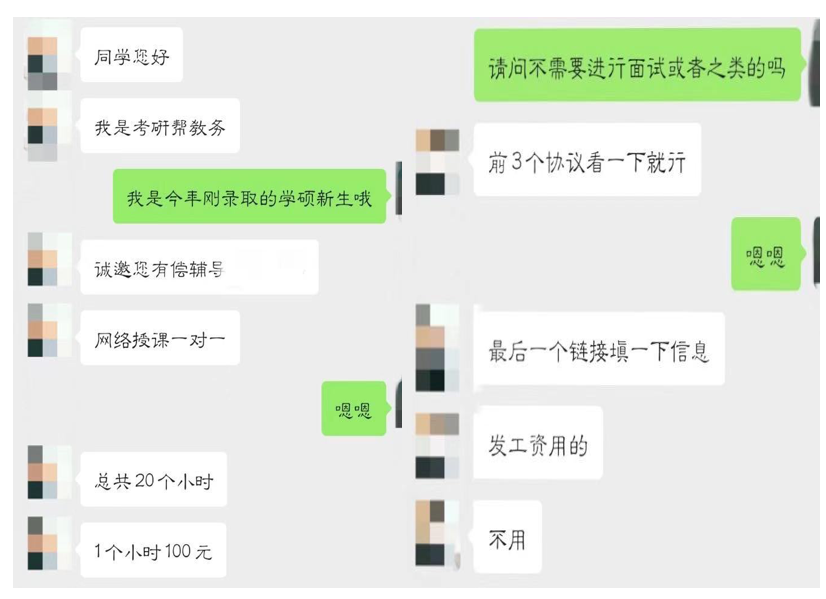 招老师的是这家机构名叫“考研帮”,在新生群里发布消息的,是一位已经在这家机构做老师的研究生。通过这名学生的推荐,霍珊联系到了机构的相关负责人,双方谈好价格后,不到一天的时间,霍珊顺利地得到了一份代课工作,为某位备考她所在大学研究生的考生代课,薪酬是100元/小时。