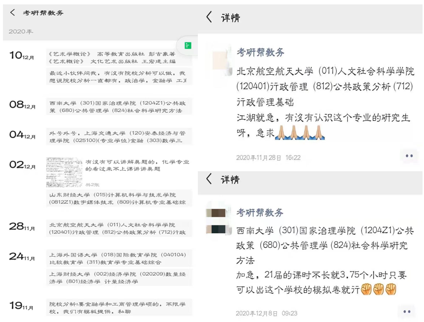 而在距2021年考研还不到半个月的冲刺阶段,那位考研帮教务还在朋友圈发消息招揽老师,例如“有没有可以讲解真题的,化学专业的看过来,不上课讲讲真题”、“加急,21届的课时不长就3.75个小时,只要可以出这个学校的模拟卷就行”、“要金融和工商管理学硕的,不限学校,我们有模板提供”.....