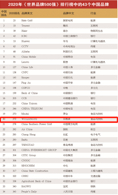 在食品与饮料行业中,五粮液与可口可乐、百事、雀巢等世界知名品牌共同进入世界500强。值得一提的是,2020年中国共有43个品牌入选,数量首次超越英国,在所有国家中位列第四,并且有继续上升的趋势。其中,五粮液在中国品牌中表现亮眼。