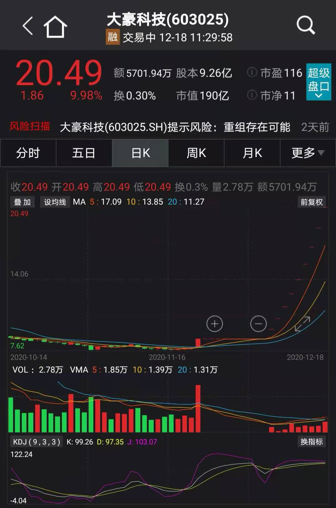 因重组事件受到市场关注,大豪科技自12月8日复牌后已经连续收获9个涨停板,近半个月内涨幅超135%。截至12月18日午间收盘,A股总市值为190亿元,半日成交额为5701.94亿元,换手率为0.3%。