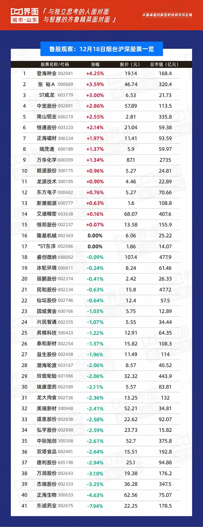 原标题:鲁股观察| 12月18日:东诚药业跌幅居全省首位,全省88只个股上涨