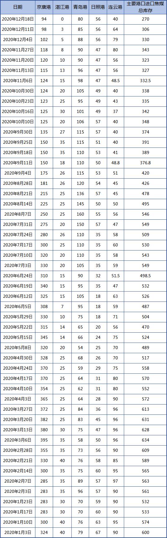 以下为2020年1月以来中国主要港口进口焦煤库存:(单位:万吨)