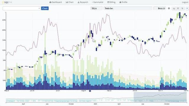 • 由于特斯拉股票受看涨期权收益的驱动,它就成了贪婪者们的奴隶:受制于期权价格(隐含波动率)与delta(股票敞口)之间的关系。