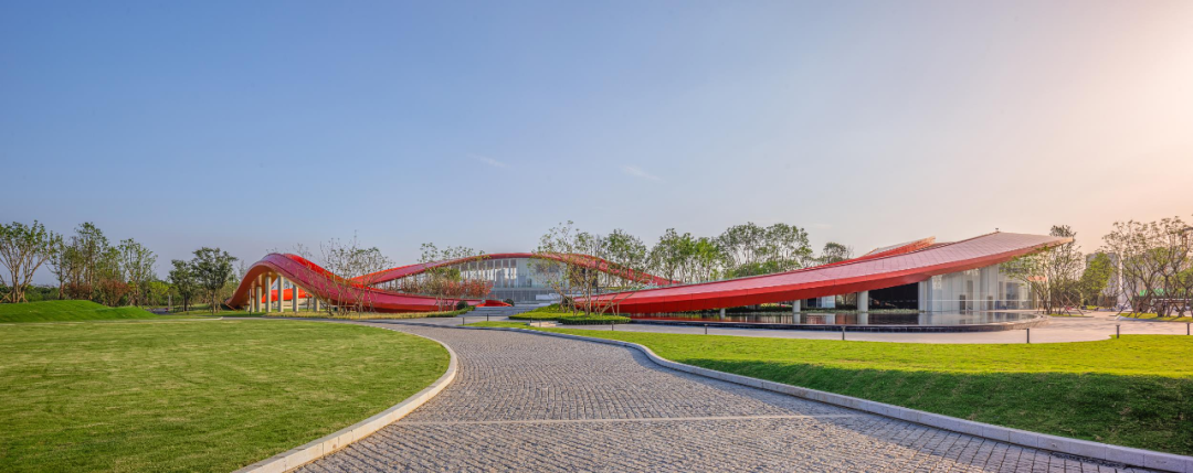 一座依山起伏的红色环形建筑,环抱着绿意盎然的公园。这座名为“智慧之环”的建筑,是天府芯城的文化地标建筑。15218片红色铝板围合成起伏灵动的环状造型,没有尽端、没有背面,象征着万物互联,智慧和科技无限演进的精神和对美好生活的向往。