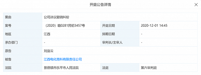 实际上就在2020年12月1日还开庭审理了一起案件,原告为刘宜云,被告为电化高科,案由为“公司决议撤销纠纷”。