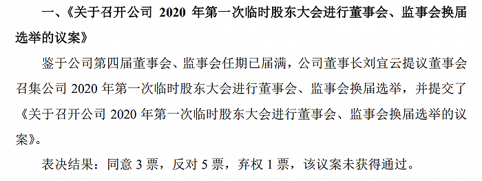 此前11月30日世龙实业召开第四届董事会第二十三次会议,相关议案《关于召开公司2020年第一次临时股东大会进行董事会、监事会换届选举的议案》遭遇5票反对1票弃权被否,召集者系世龙实业董事长刘宜云。