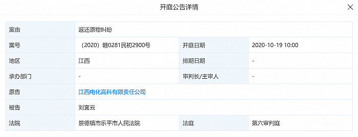 界面新闻记者注意到,就在2020年10月19日,由电化高科状告刘宜云有关“返还原物纠纷”的案件开庭,案号为(2020)赣0281民初2900号,法院为乐平市人民法院。