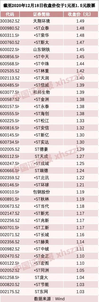 除了*ST刚泰、*ST金钰,目前市场仍有多只“仙股”。Wind数据显示,截至12月18日收盘,共有7只股票的价格低于1元,且清一色为ST股。