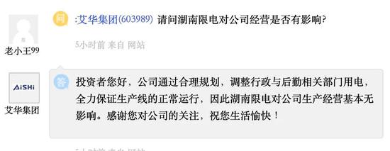 艾华集团称,公司通过合理规划,调整行政与后勤相关部门用电,全力保证生产线的正常运行,因此湖南限电对公司生产经营基本无影响。