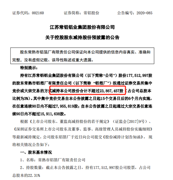 答:控股股东铝箔厂于12月15日通过集中竞价交易系统减持公司股份50万股。