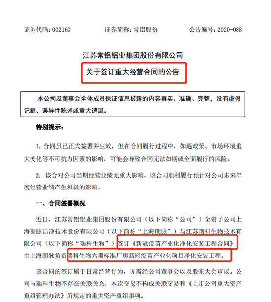 常铝股份的这次信息披露的问题点在于,自愿性信息披露没有保持一惯性,公司2015年就完成了对上海朗脉的收购,在此之前一直没有进行类似的公告,此次涉及到“新冠疫苗”热点就进行了披露,难免让人和蹭热点联想到一起,关键是看交易所后面有没有进一步的措施。