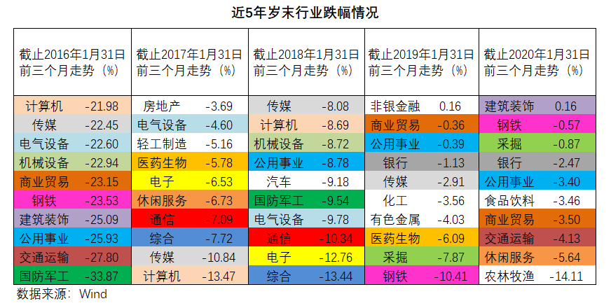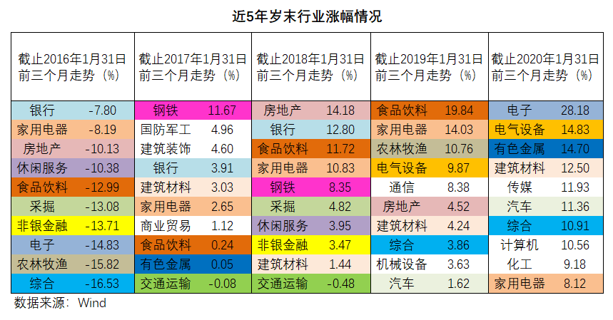 以上图表是近5年以来,从11月初到1月底这3个月,28个申万行业中涨幅排名前十的一些对比。