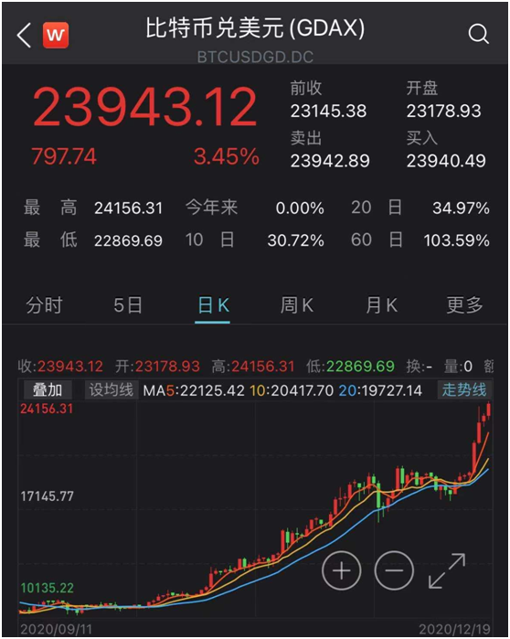 今天凌晨,比特币价格冲破24000美元,最高至24156美元,继续刷新历史新高。