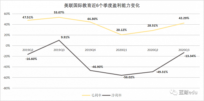 上市后的美联国际教育的毛利率也陷入谷底,从2019年的45%左右大幅下滑到20%,三季度,美联国际教育的毛利率虽然有所回升,但仍未达到去年的水准。