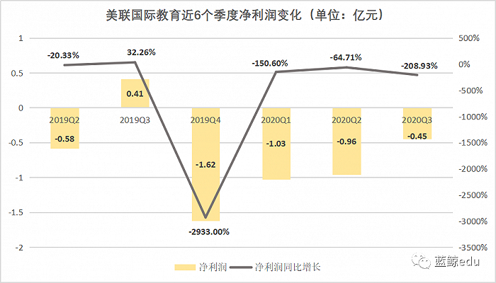亏损情况同样堪忧。目前,美联国际教育已经连续亏损了4个季度。近6个季度,除2019年Q3外,5个季度净利润均为亏损状态。其中2019年Q4净利润亏损达1.62亿元,同比大幅下降近3000%。