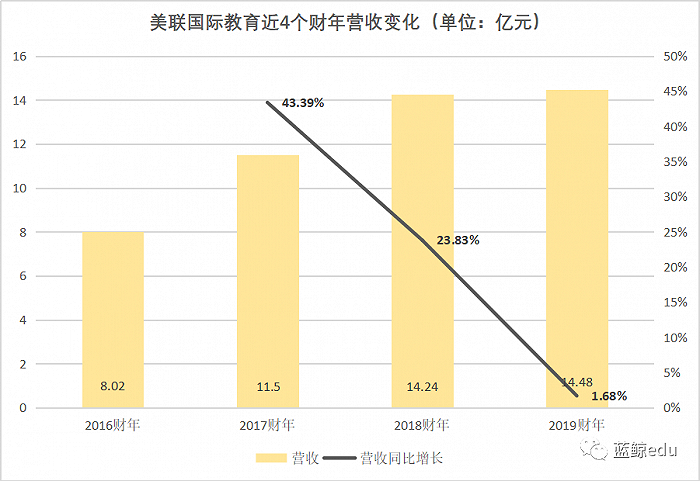2017年-2019年,美联国际教育的营收同比增长率直线下降,从43.39%一路降至1.68%。仅2019年一年,其营收增速就同比减少了超20个百分点。