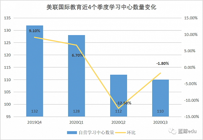 面对疫情冲击,美联国际教育处于战略收缩状态。最近四个季度,其学习中心数量持续减少。2020年Q3,美联国际教育共有110个自营学习中心在运营,比去年年末减少了22家。