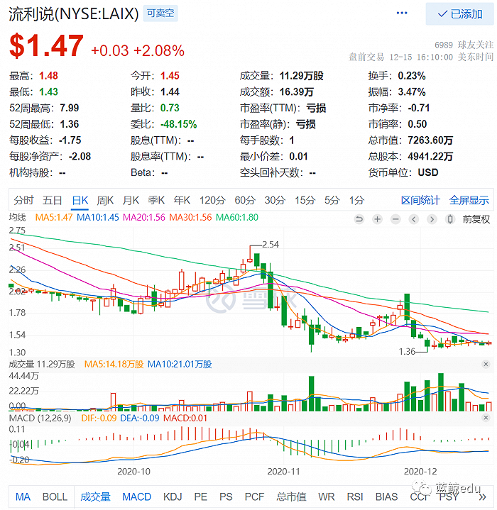 去年11月,美联英语冲击美股。独立上市失败后退而寻求借壳,但估值却被打了八折。今年3月,美联英语所属的美联国际教育科技集团完成与EdtechX公司的合并交易,正式以新实体Meten EdtechX登录纳斯达克。只可惜“上市即巅峰”,其股价一路暴跌9成。