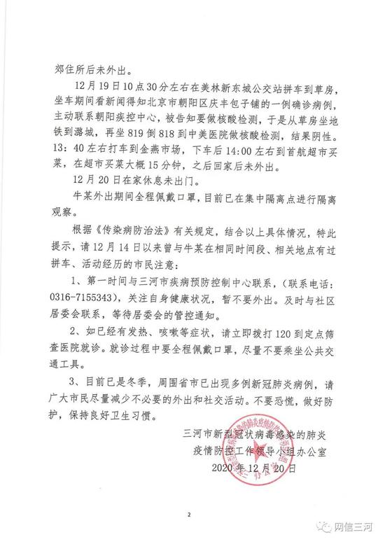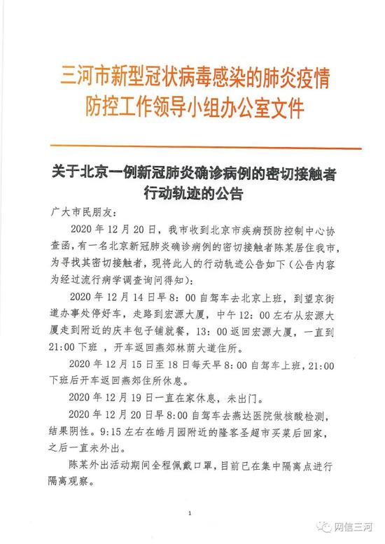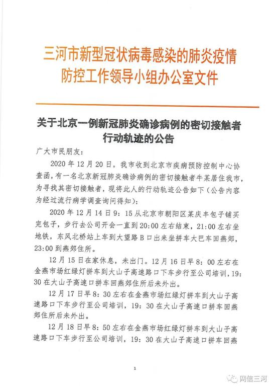 据“网信三河”公众号刚刚发布的消息,河北省三河市通报两例确诊病例的密切接触者行动轨迹。